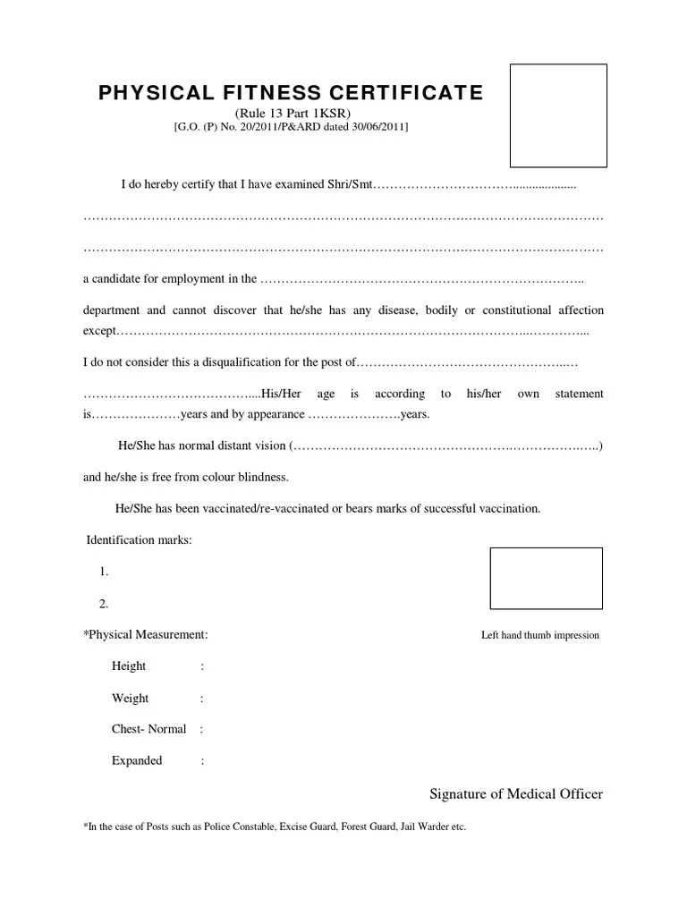 I, _____, with medical registration number ____, have examined shri/ smt ___ and certify that my client is free from any disease. 5 steps to prepare a medical fitness certificate step 1: Certificate of medical fitness (to be deposited a t the time of joining) to be obtained only from gazetted government medical officer/medical officer of a government undertaking. Since it is an official certificate and it can be used for numerous reasons including … 05/01/2019 · physical fitness certificate template editable free microsoft word & pdf format. It is also compatible so you can add your information to make it your own! A n entrepreneur will feel doubtful to hire new employees without being sure of his physical or health condition. Provide a proper heading to the document sample. Physical fitness and health certificate.pdf. Physical fitness and health certificate.pdf. I have conducted the medical examination on _______ with the consent of my client... 5 steps to prepare a medical fitness certificate step 1: